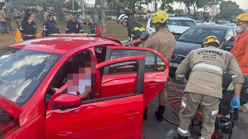 Um grave acidente registrado por câmeras de segurança em Goiânia deixou um morto e várias pessoas feridas na tarde deste domingo (26/10). O episódio aconteceu na Praça C-170, no Setor Jardim América, e envolveu seis veículos.