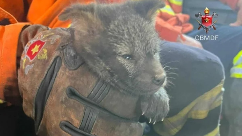 Bombeiros resgatam filhote de cachorro-do-mato em incêndio no DF