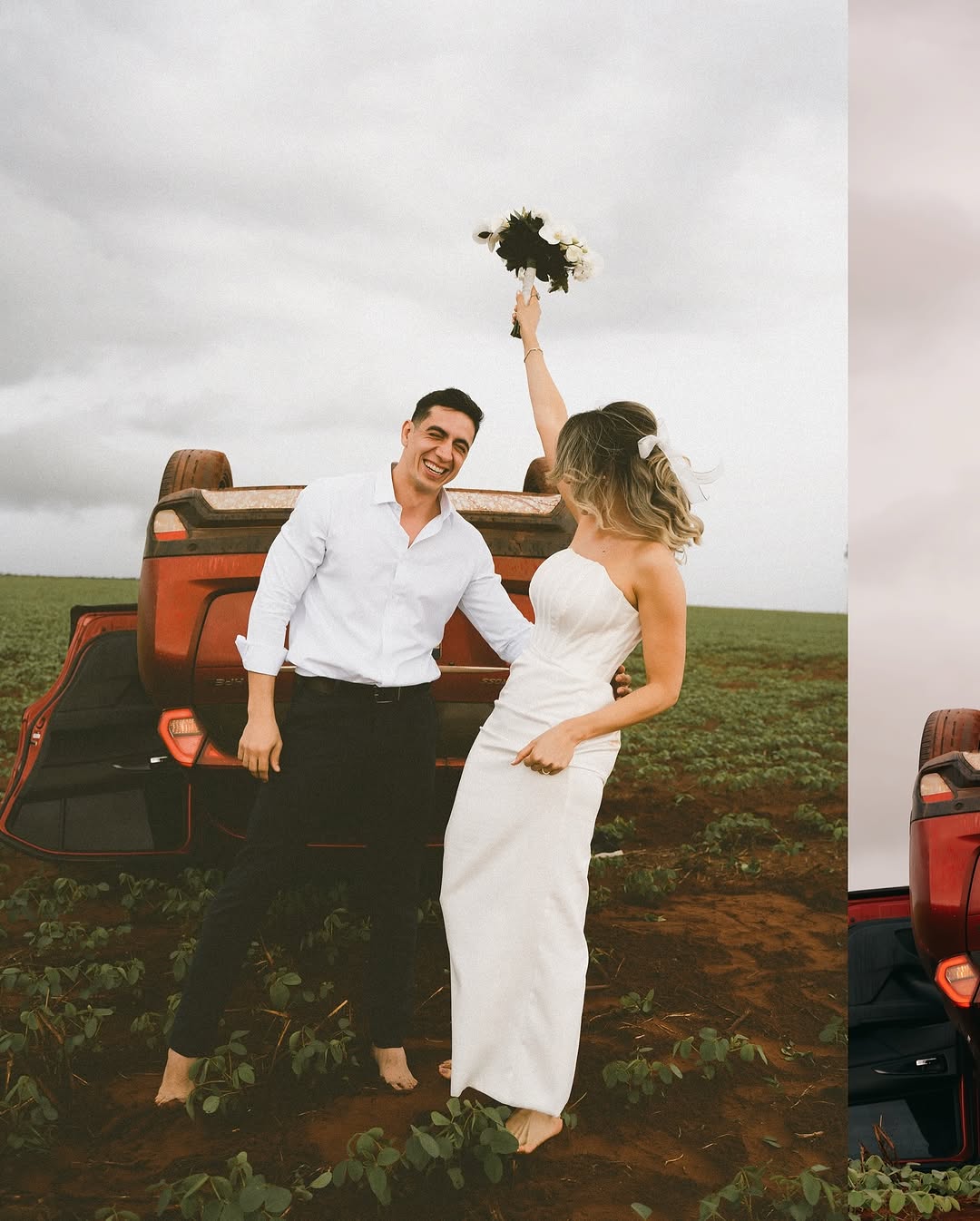 Durante o trajeto, um cachorro do mato atravessou a pista em meio à chuva, dificultando a visibilidade. Kelmer tentou desviar, mas acabou capotando o veículo ao entrar em uma área de terra fofa de uma plantação de soja. Apesar do susto, o casal decidiu aproveitar a situação e pediu ao fotógrafo Arthur Dourado (@arthurdouradoph) para realizar as fotos no próprio local do acidente.