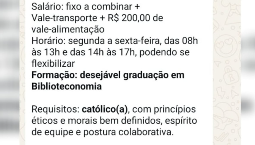 Entre os requisitos listados, no entanto, estava em destaque a frase: “ser católico(a), com princípios éticos e morais bem definidos, espírito de equipe e postura colaborativa”. O detalhe causou espanto porque, no mesmo anúncio, a formação em Biblioteconomia aparecia apenas como “desejável”.