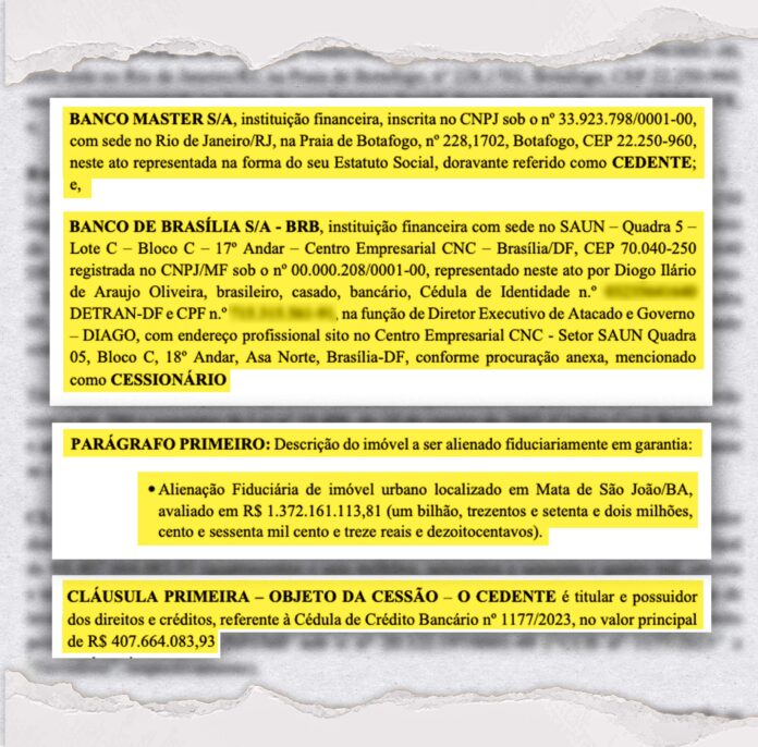 De acordo com as informações, o Banco Master teria utilizado como garantia um imóvel localizado na Bahia que, segundo a apuração, não estaria devidamente apto a respaldar a operação. A instituição teria vendido ao BRB carteiras de crédito que apresentariam garantias consideradas inconsistentes ou irregulares.