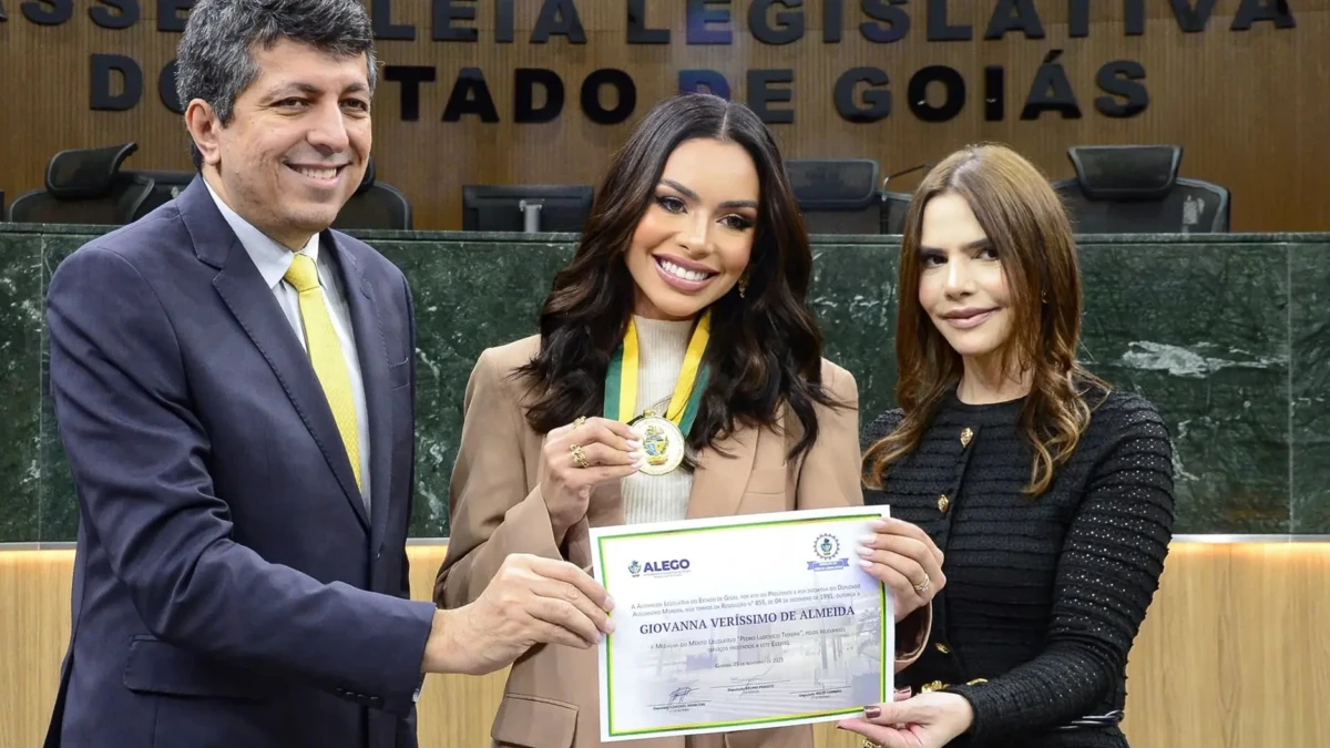 A modelo e especialista em imagem Giovanna Veríssimo foi agraciada nesta terça-feira (25) com a Medalha do Mérito Legislativo Pedro Ludovico Teixeira, a maior honraria concedida pela Assembleia Legislativa de Goiás. A sessão solene foi presidida pelo deputado estadual Alessandro Moreira (PP).