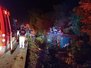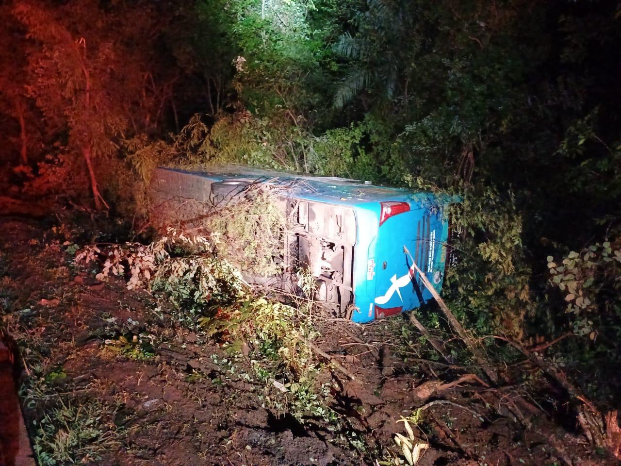 Na madrugada desta quarta-feira (4), um ônibus de transporte rodoviário tombou na BR-153, em Santa Tereza de Goiás, região norte de Goiás. O coletivo transportava 27 ocupantes, um bebê e três homens, de 25, 43 e 65 anos, foram encaminhados para uma unidade de saúde em Porangatu.