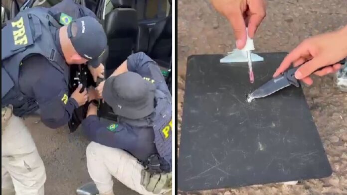 Diante das contradições, a equipe intensificou a fiscalização. Em busca pessoal, foram encontradas pequenas porções de cocaína e maconha com o condutor. Em seguida, durante vistoria detalhada no veículo, os policiais localizaram dois tabletes de cocaína escondidos no interior da porta do passageiro.