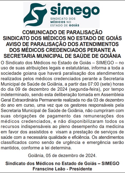 O Sindicato dos Médicos no Estado de Goiás (SIMEGO) anunciou uma paralisação dos atendimentos realizados pelos médicos credenciados à Secretaria Municipal de Saúde de Goiânia, que terá início às 07h do dia 9 de dezembro de 2024, por tempo indeterminado. A decisão foi tomada durante uma Assembleia Geral Extraordinária Permanente realizada no dia 3 de dezembro.