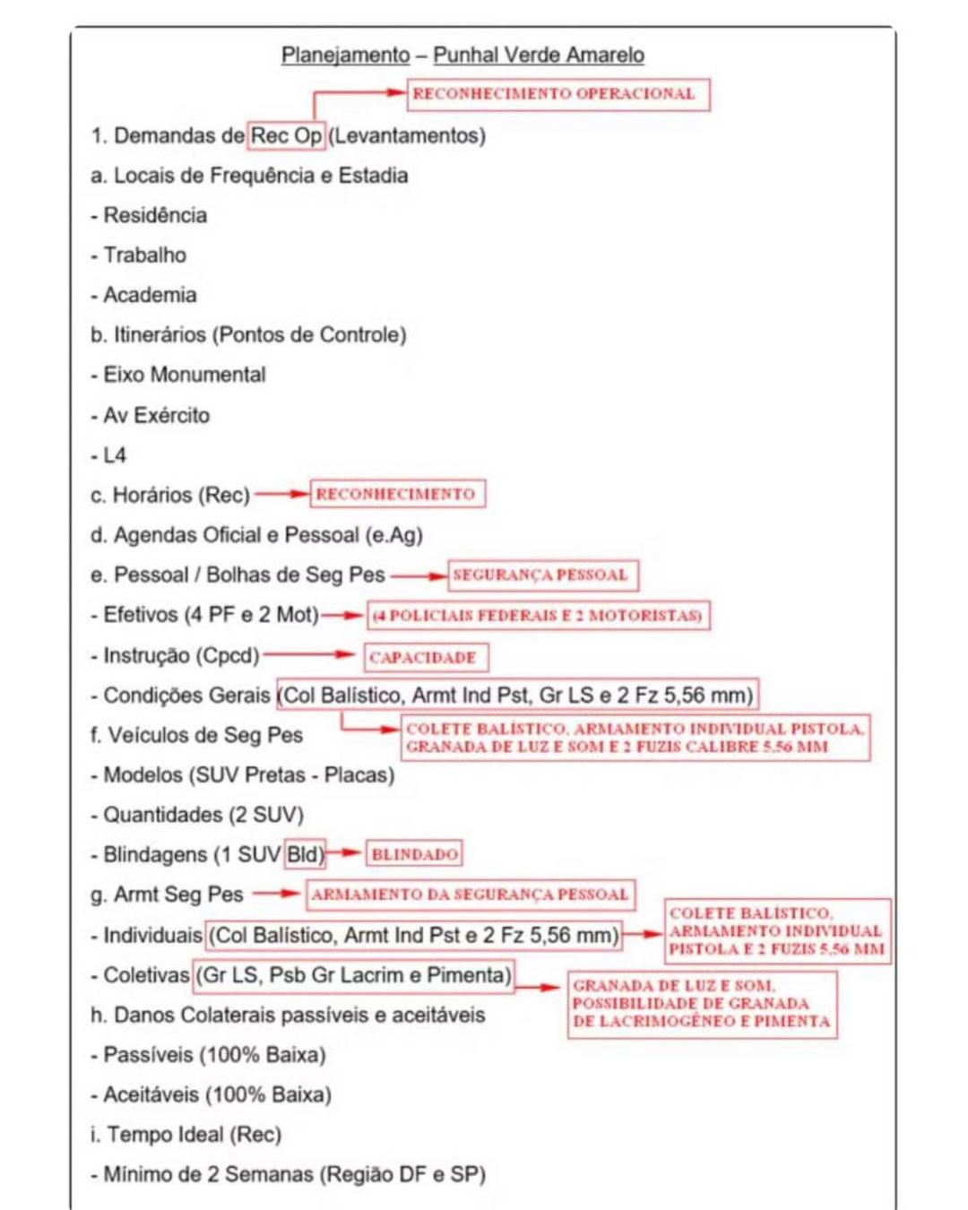 O materal intitulado “Planejamento Punhal Verde Amarelo”, traz uma série de demandas operacionais e logísticas para concluir os planos, e condições de execução. No documento, é possível identificar alguns codinomes que fazem referência as pessoas que seriam assassinadas: Jeca – que, segundo a PF, faria referência a Lula; Joca – que, também segundo a PF, seria Geraldo Alckmin; e Juca – que a PF, até esta semana, não tinha conseguido identificar.
