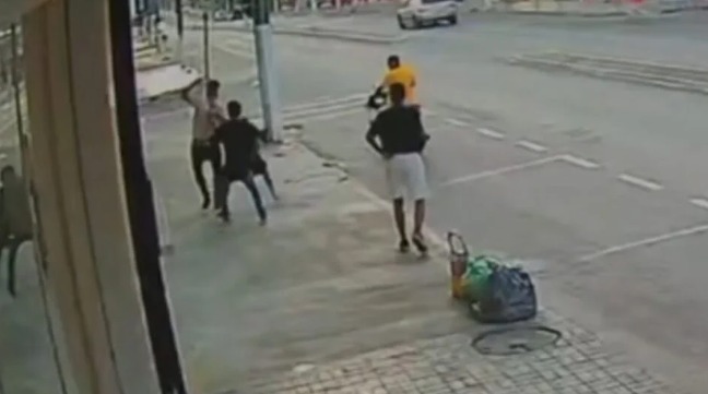 Três rapazes, então, passam pelo local e veem a cena. Um deles filma e é agredido por um dos suspeitos, que também tenta tomar o celular dele. Enquanto isso, um dos agressores retorna ao homem caído e o acerta mais duas vezes com a lata de tintas.